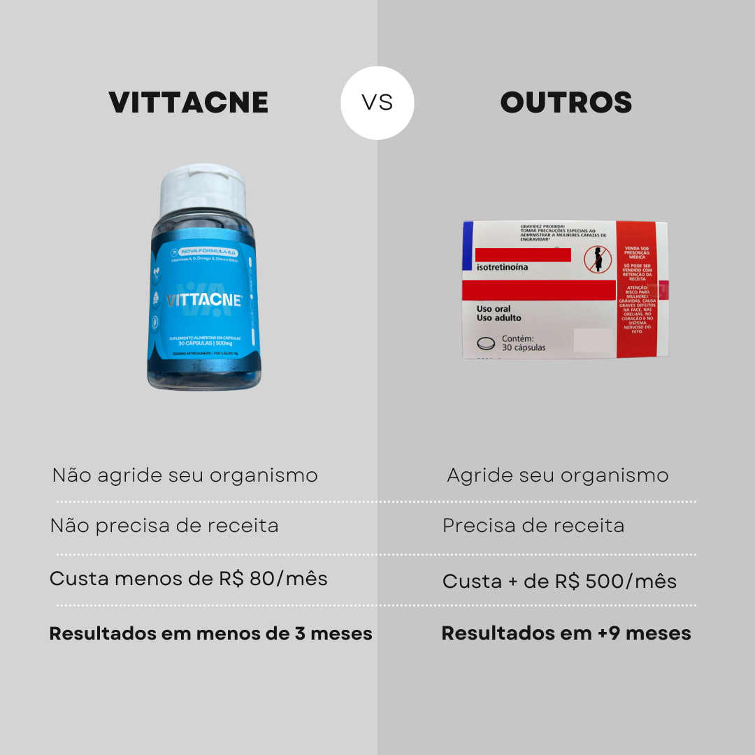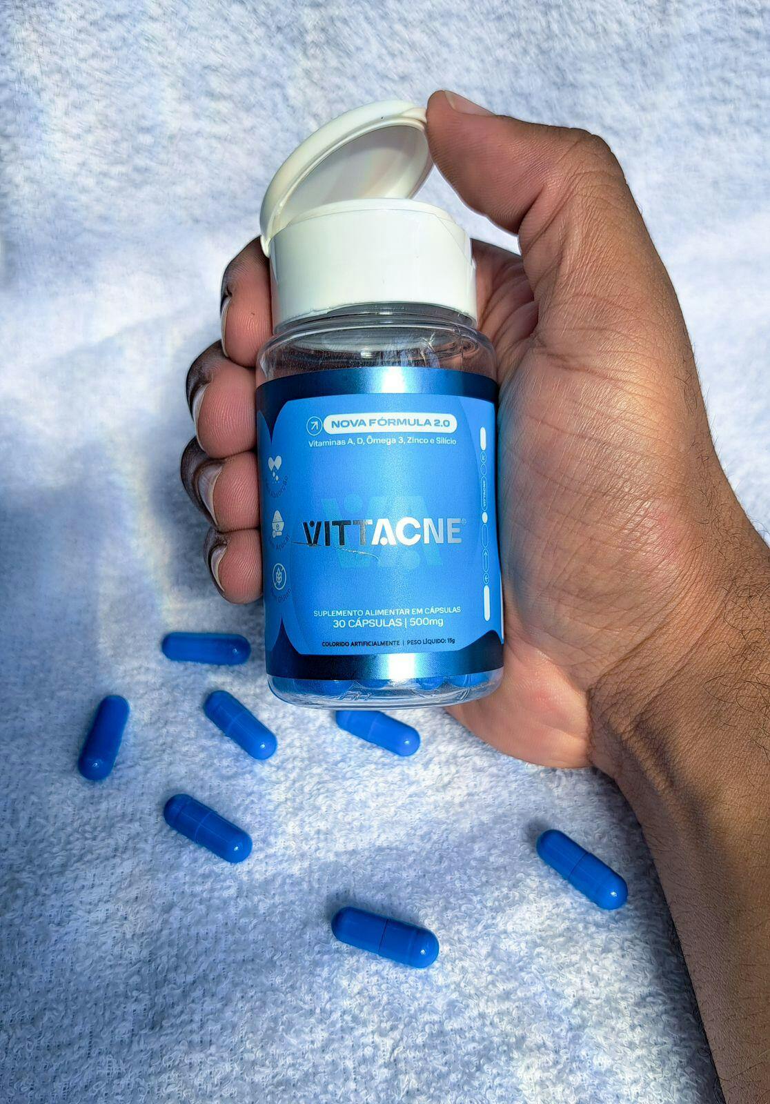 Acne é resultado do seu interior! Tudo que você come ou bebe, reflete no seu corpo. A Vittacne nasceu com propósito de trazer uma nova alternativa natural para Complementar sua dieta do dia a dia que auxiliam com quem sofre com Acne